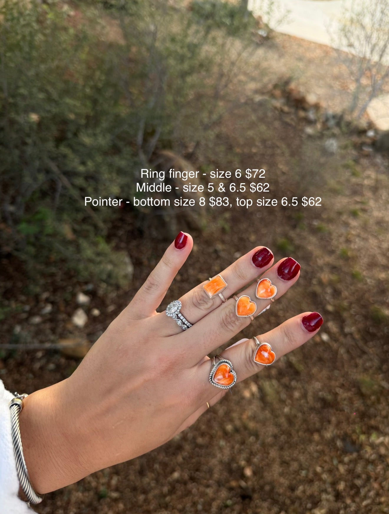These orange spiny oyster rings feature vibrant natural stones in playful heart and square shapes set in sterling silver. Bold, unique, and full of Western charm, they make a fun statement for everyday wear or stacking.