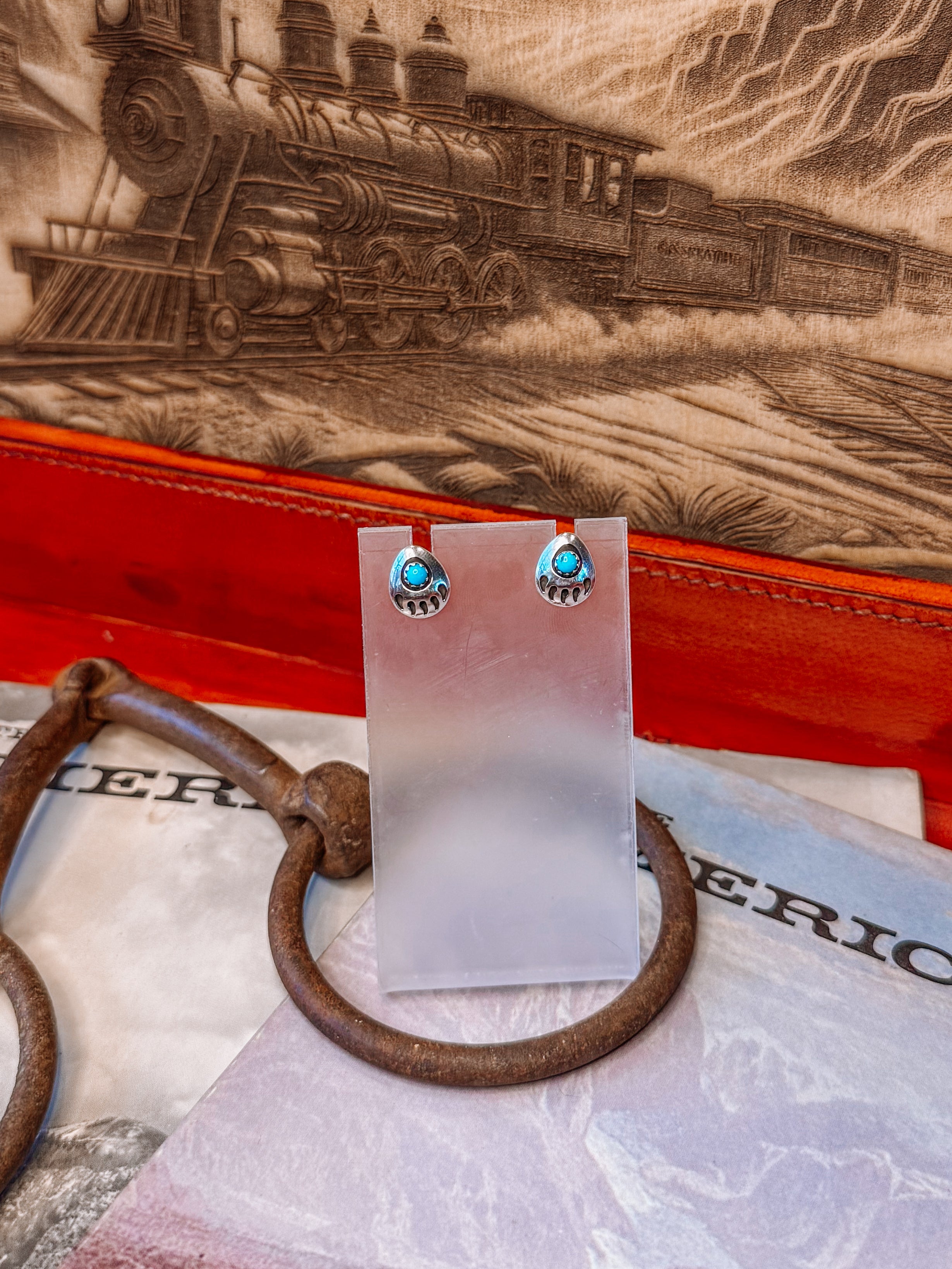 Navajo handcrafted sterling silver mini bear paw earrings with 3mm or free form turquoise stone. Measures approximately 1/2"L x 3/4"W.