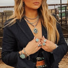 This Turquoise Cluster Pendant Necklace features a vibrant cluster of genuine turquoise stones set in sterling silver. Versatile and eye-catching, the pendant can be worn on a chain or paired with sterling silver pearls for a bold Western-inspired look.