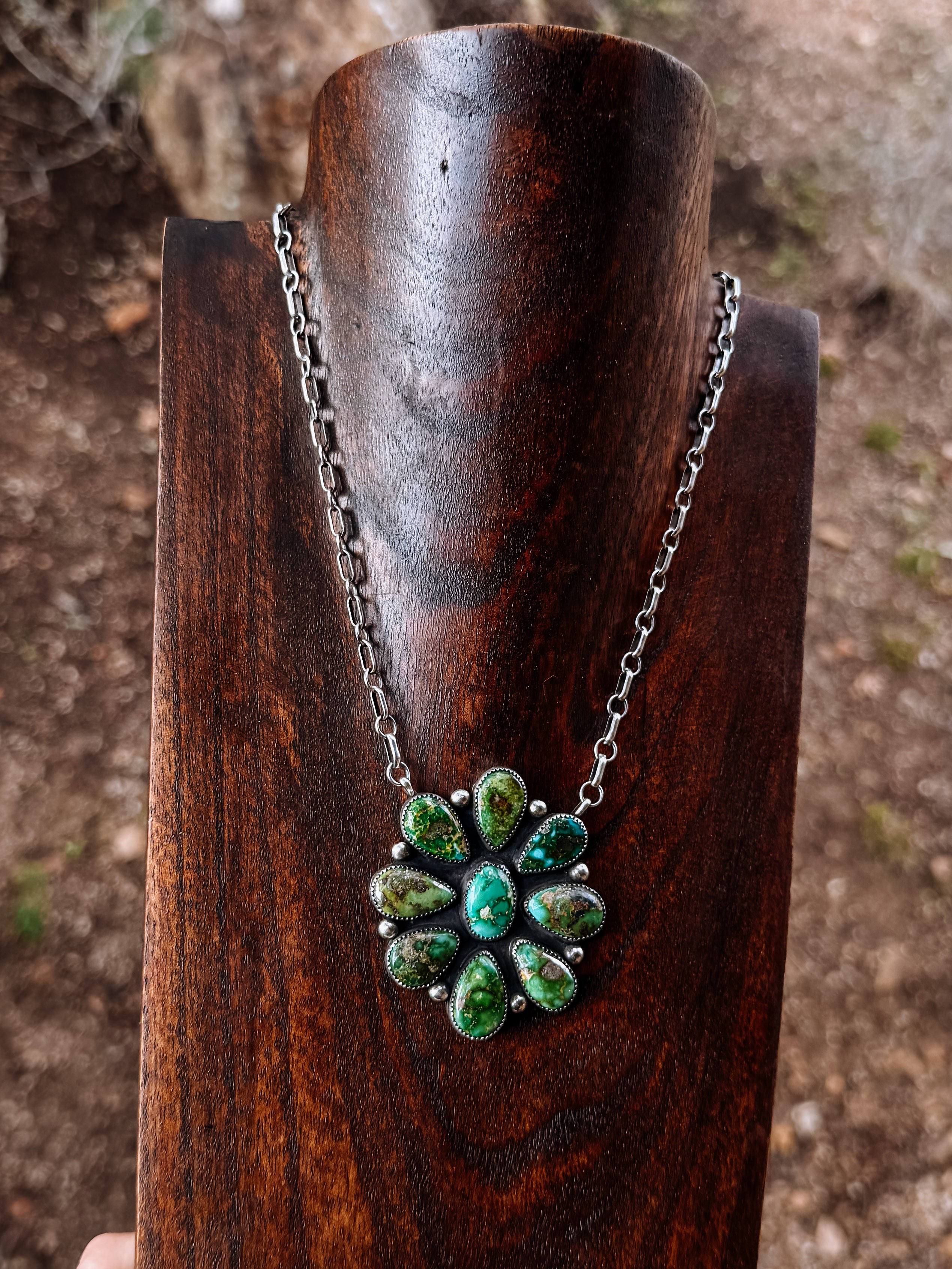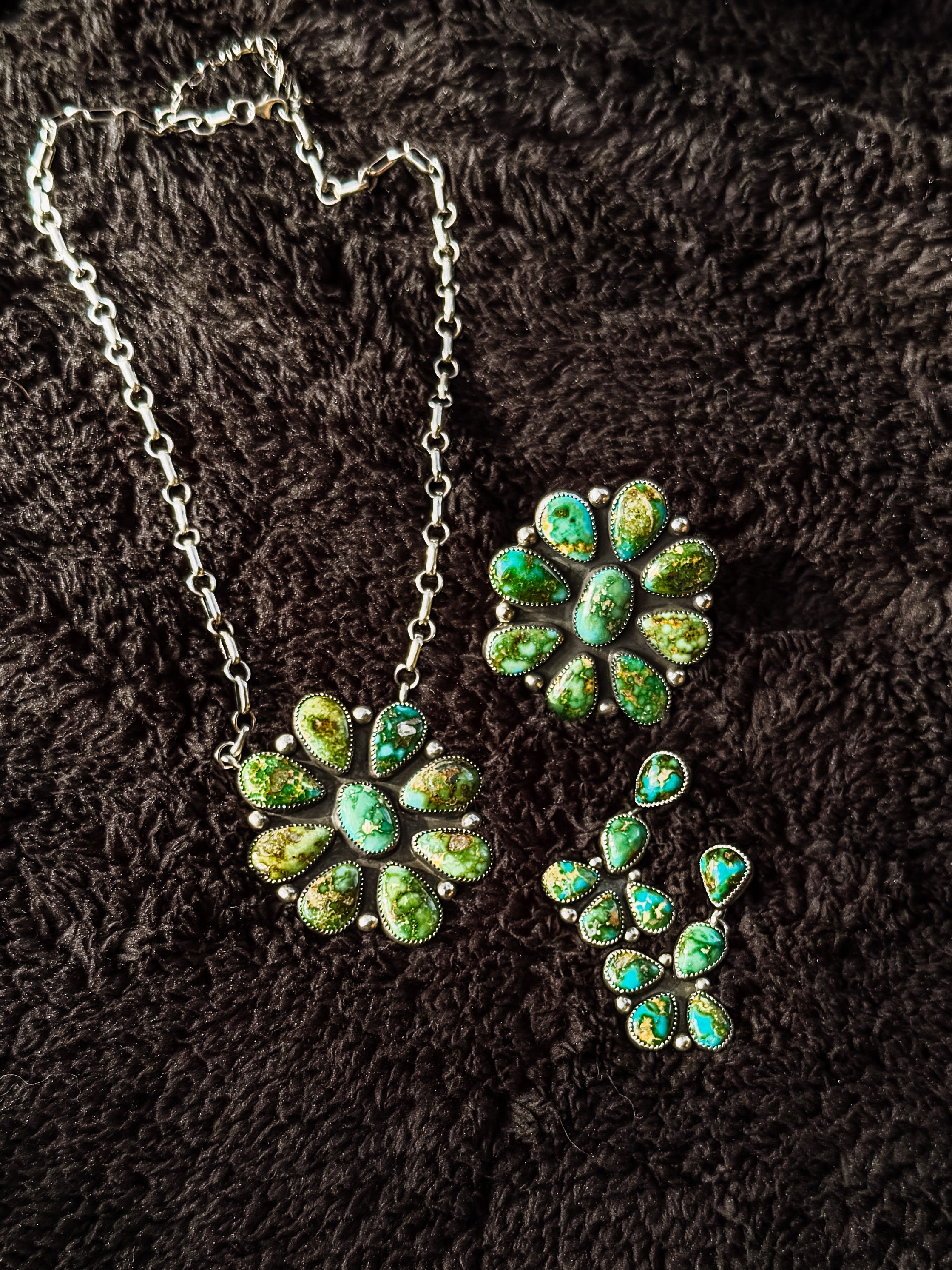 Featuring a striking cluster of Sonoran Gold turquoise, this cluster statement necklace is designed to stand out. As seen on Harley Chey at the NFR, it’s a statement piece that can be worn alone or styled with the matching earrings and ring.
