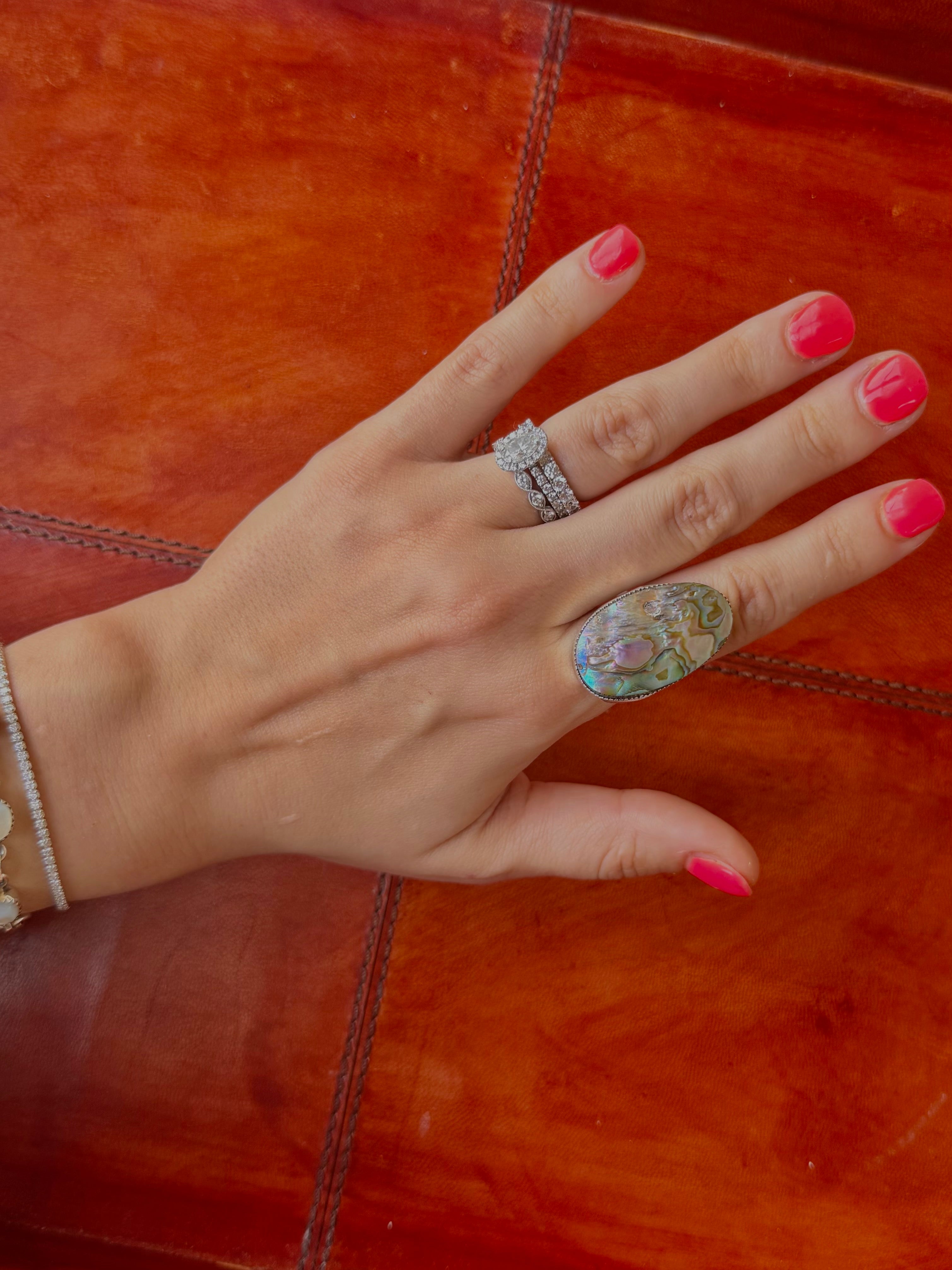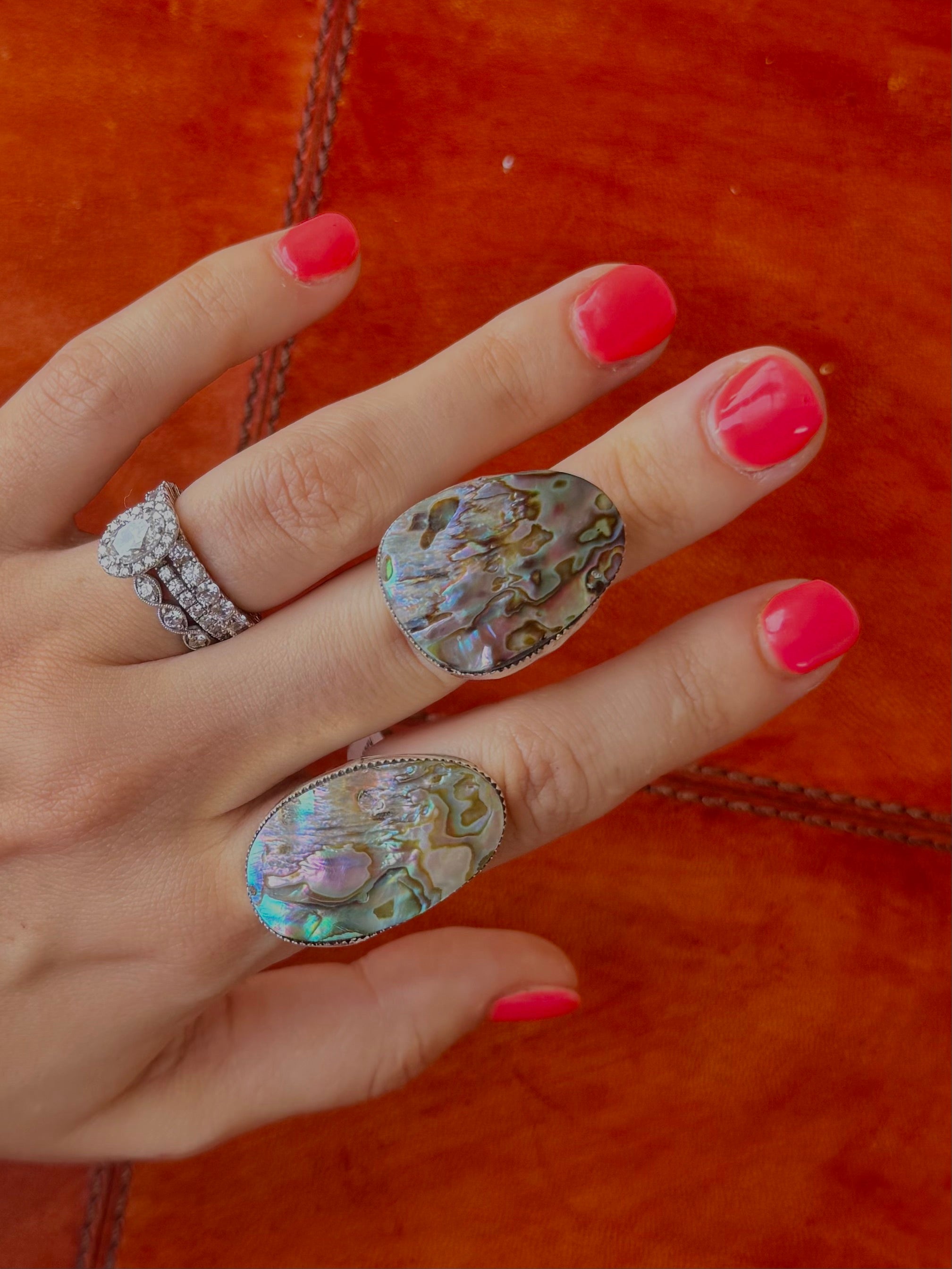 This abalone ring features a luminous shell with vibrant iridescent hues set in sterling silver for a bold, refined statement. Its shifting colors and natural pattern add an elegant pop of dimension whether worn alone or stacked with your favorite pieces.
