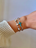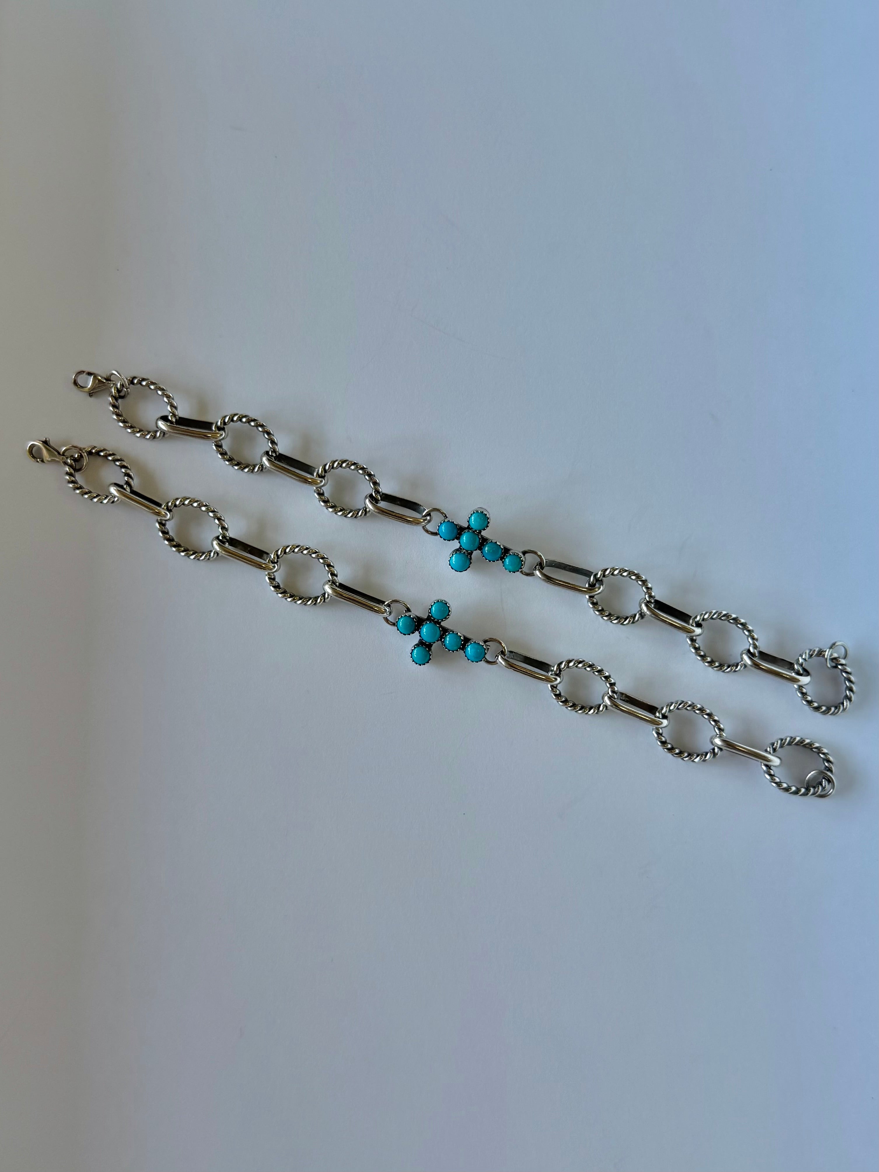 This turquoise cross link bracelet features vibrant stones set in sterling silver for a meaningful, refined statement. Its linked design adds graceful movement and a timeless touch, perfect for everyday wear or stacking with your favorite pieces.