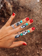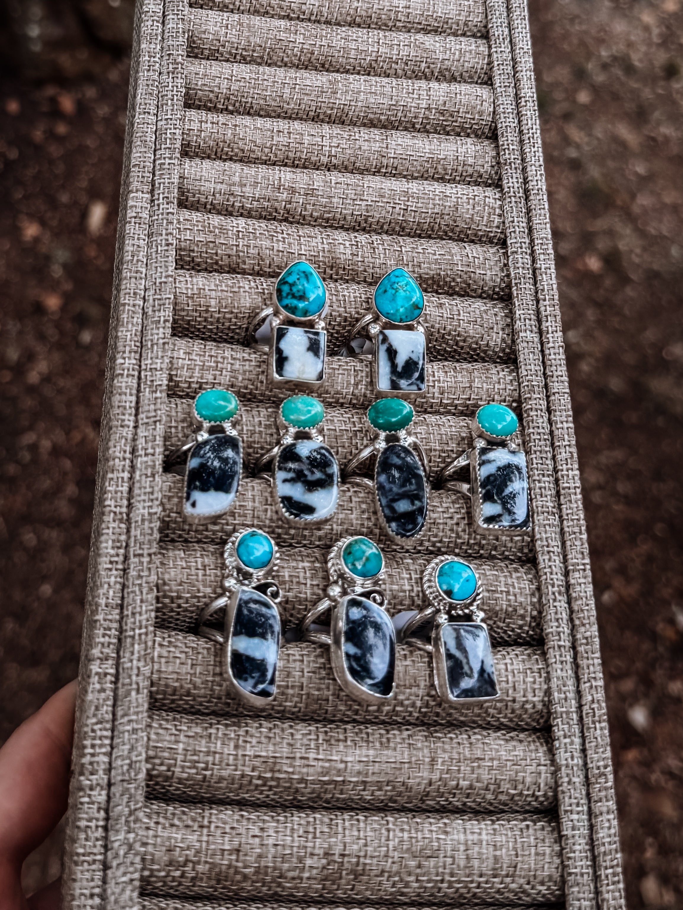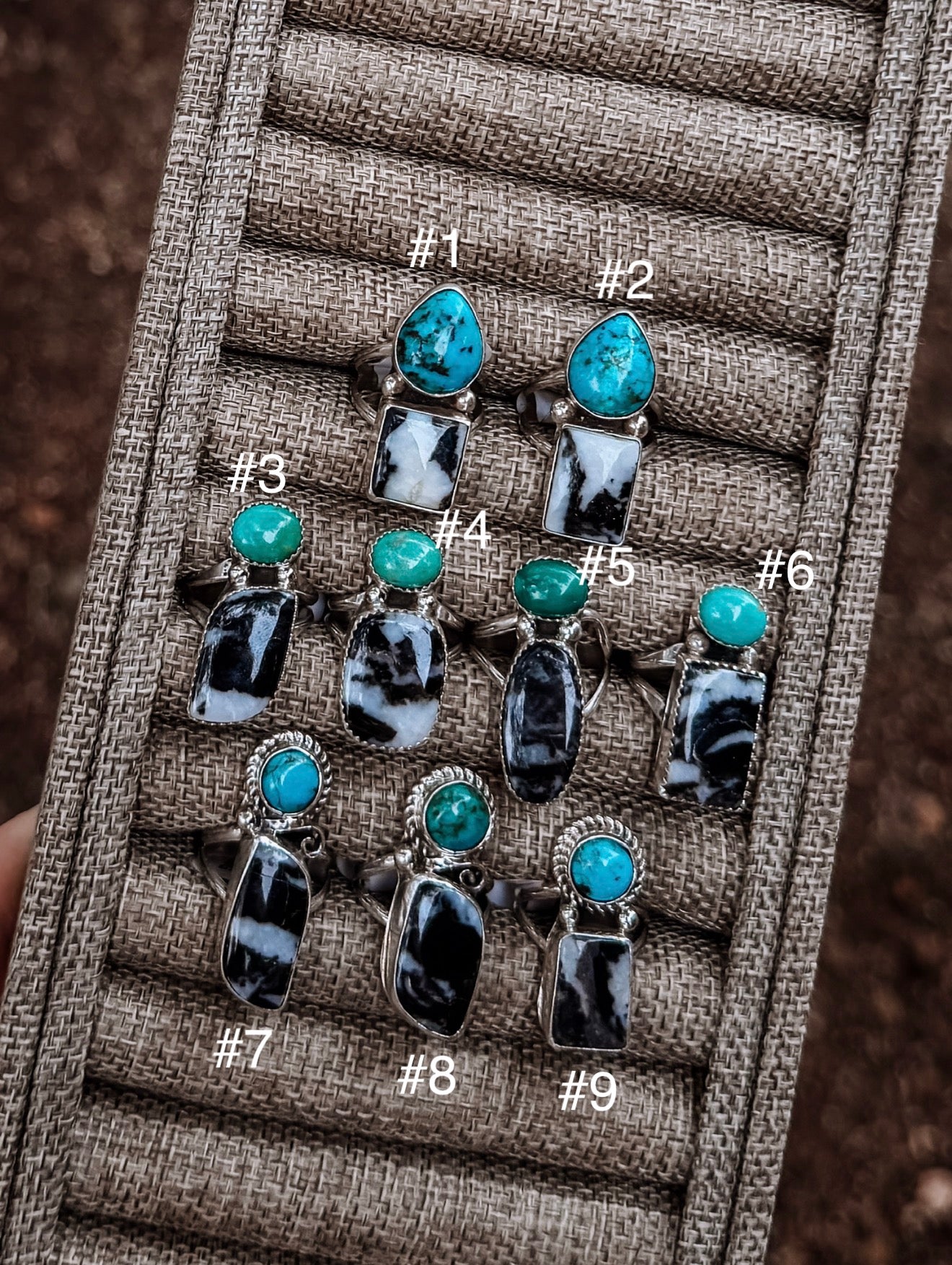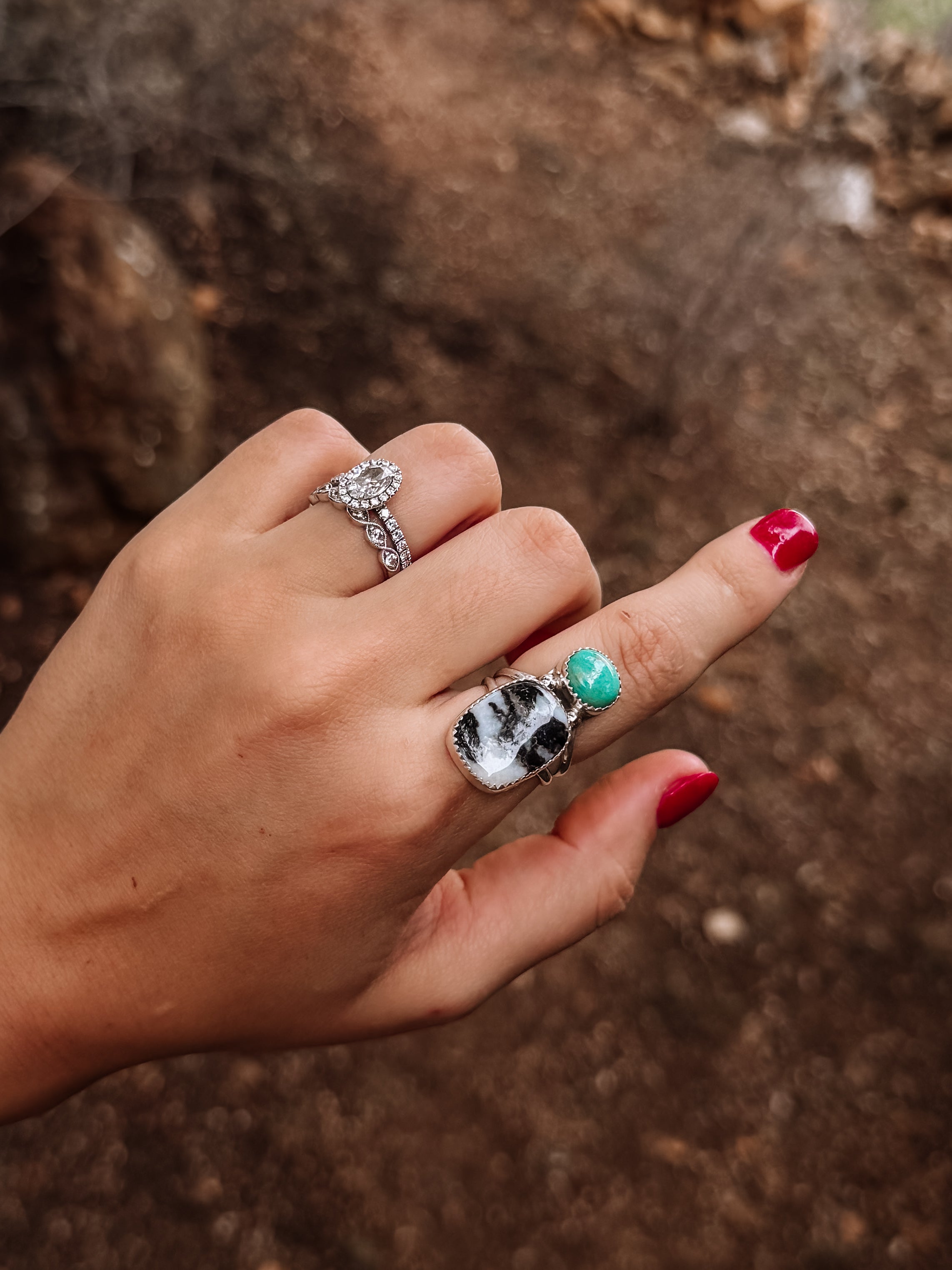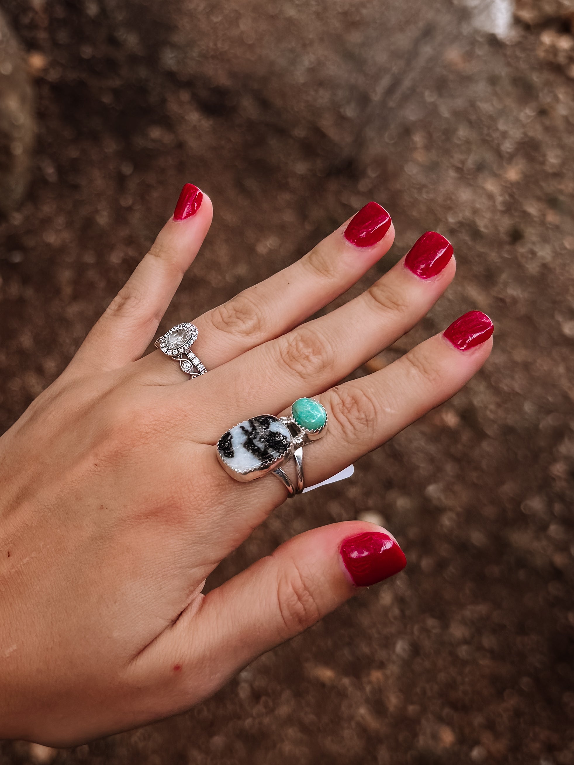 A striking two-stone ring featuring Zebra Jasper and Turquoise, perfect for layering or wearing solo as a statement accessory.