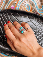Designed to make a statement, this adjustable turquoise ring showcases two stones and a feather accent—perfect for everyday wear or special occasions.