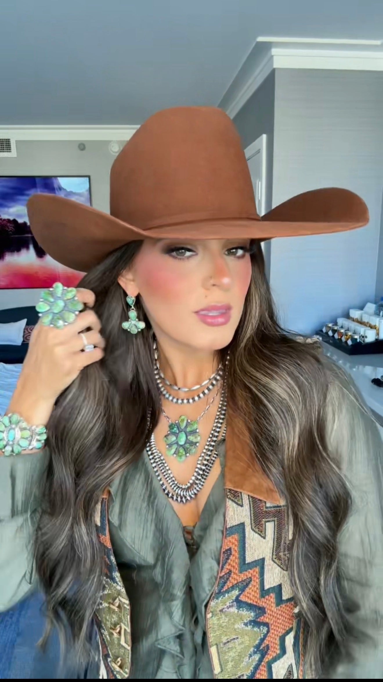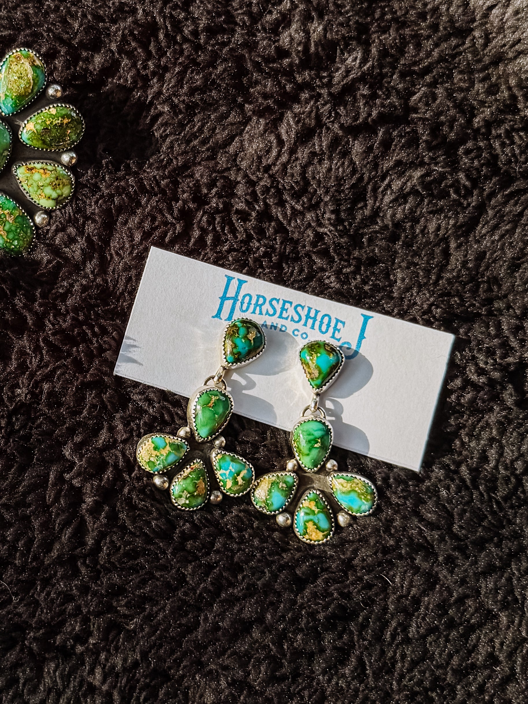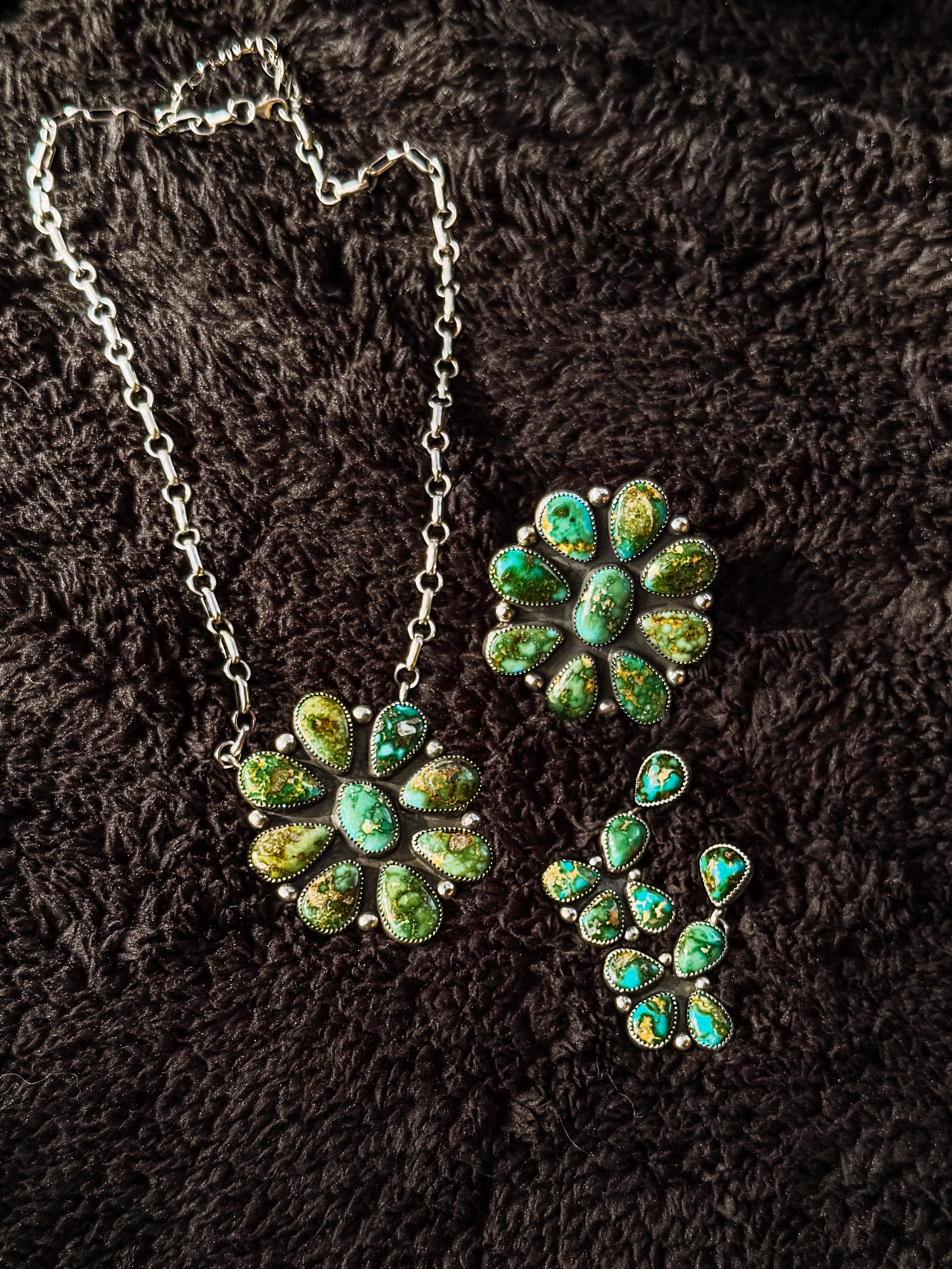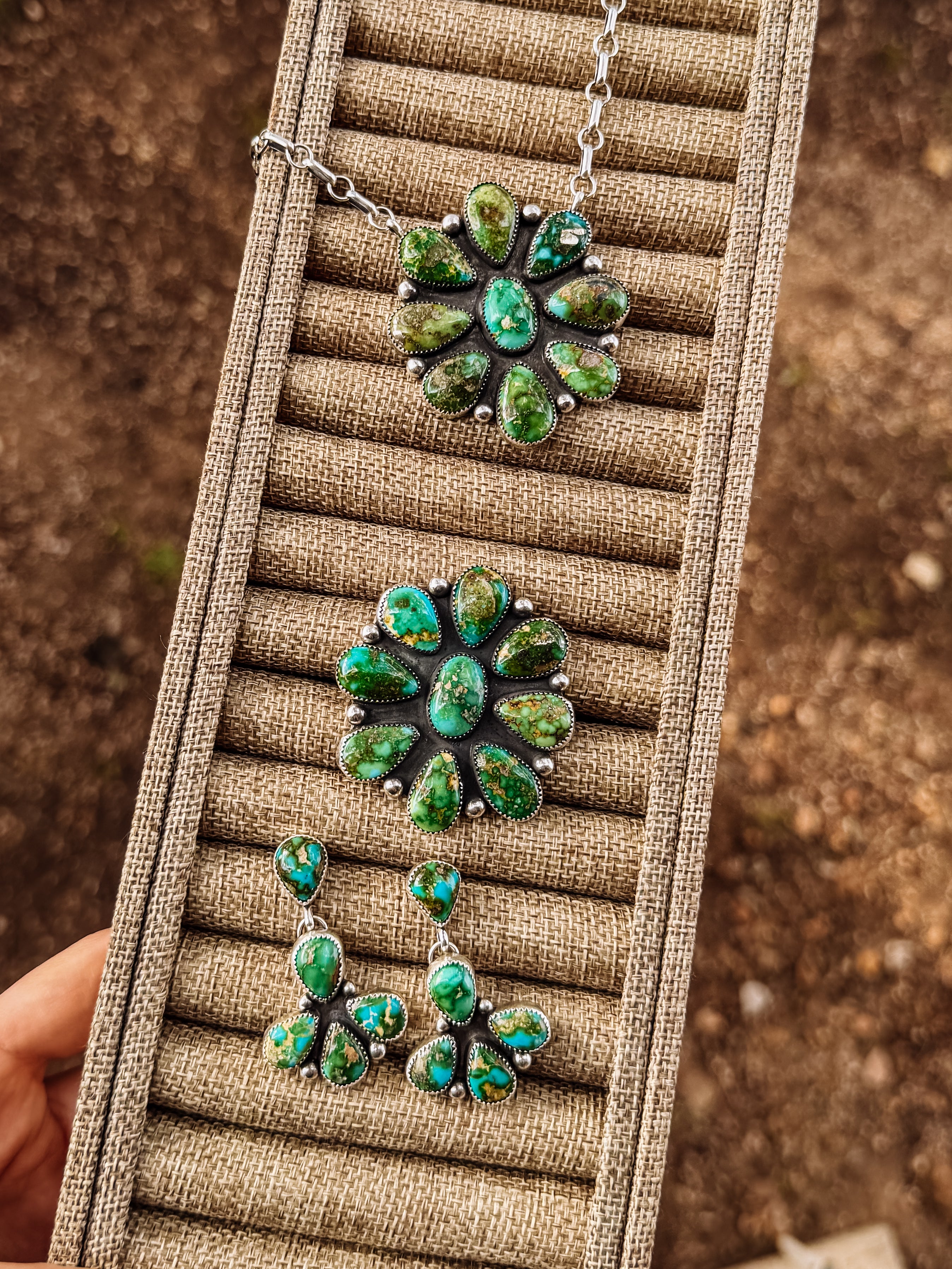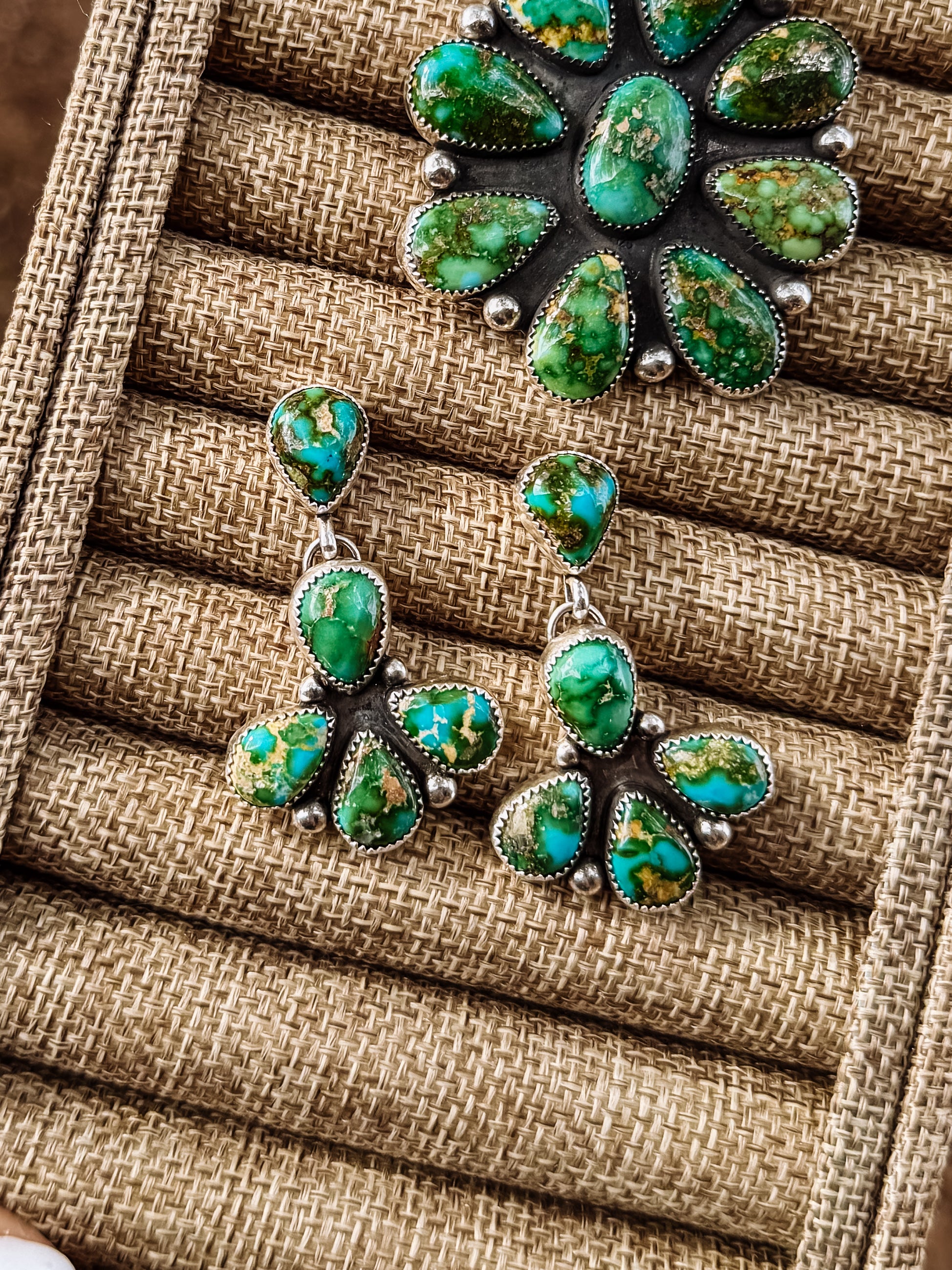 Featuring a striking cluster of Sonoran Gold turquoise, these earrings are designed to stand out. As seen on Harley Chey at the NFR, it’s a statement piece that can be worn alone or styled with the matching necklace and ring.