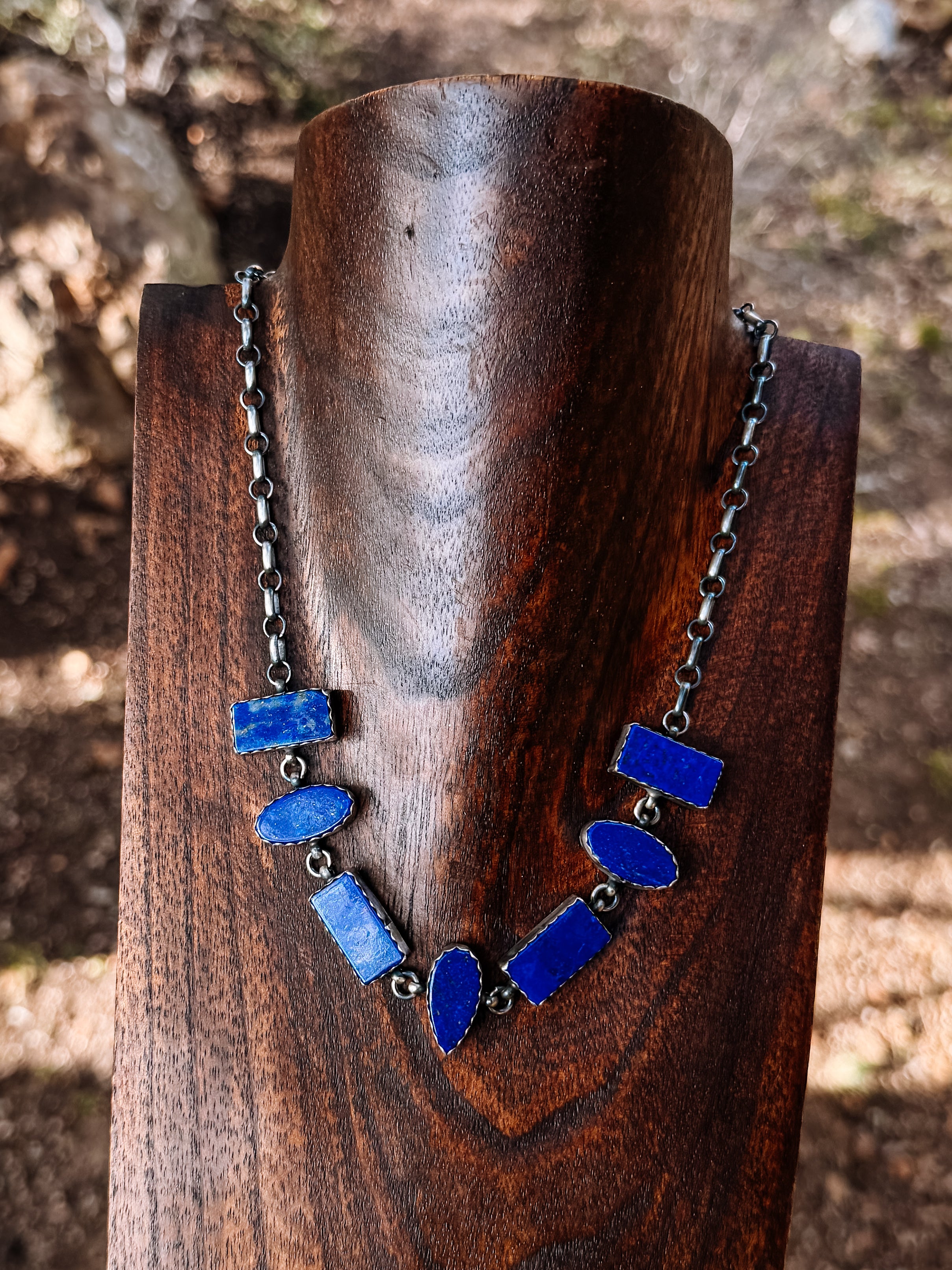 A timeless Blue Lapis necklace featuring seven rich blue stones set in sterling silver. Balanced and bold, this piece is designed to make a statement while remaining effortlessly wearable. A beautiful statement.