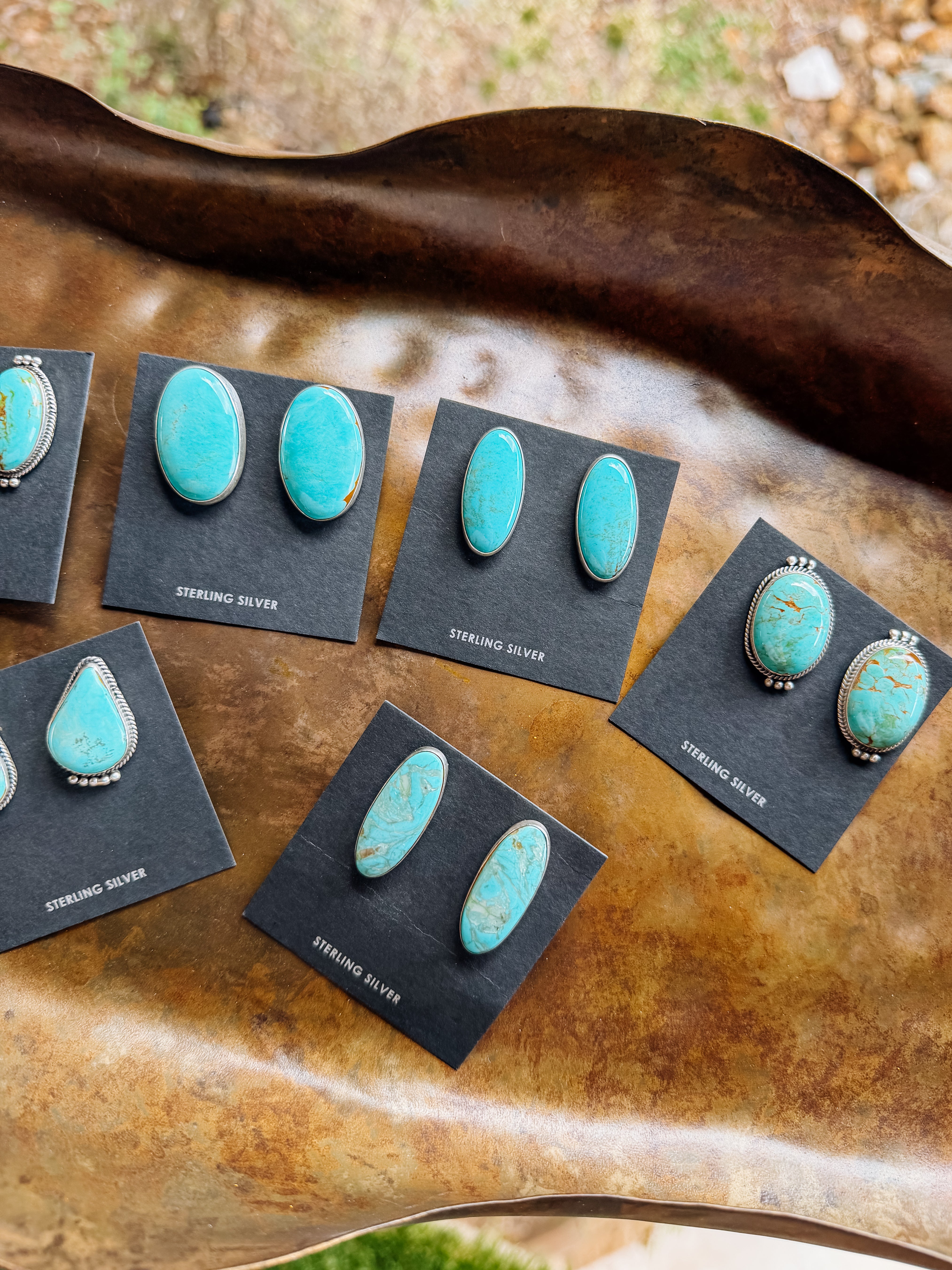 Handcrafted Native-made turquoise and sterling silver stud earrings. Genuine turquoise stones set in solid .925 sterling silver for a classic, timeless Western style. Perfect everyday studs with authentic artisan craftsmanship.
