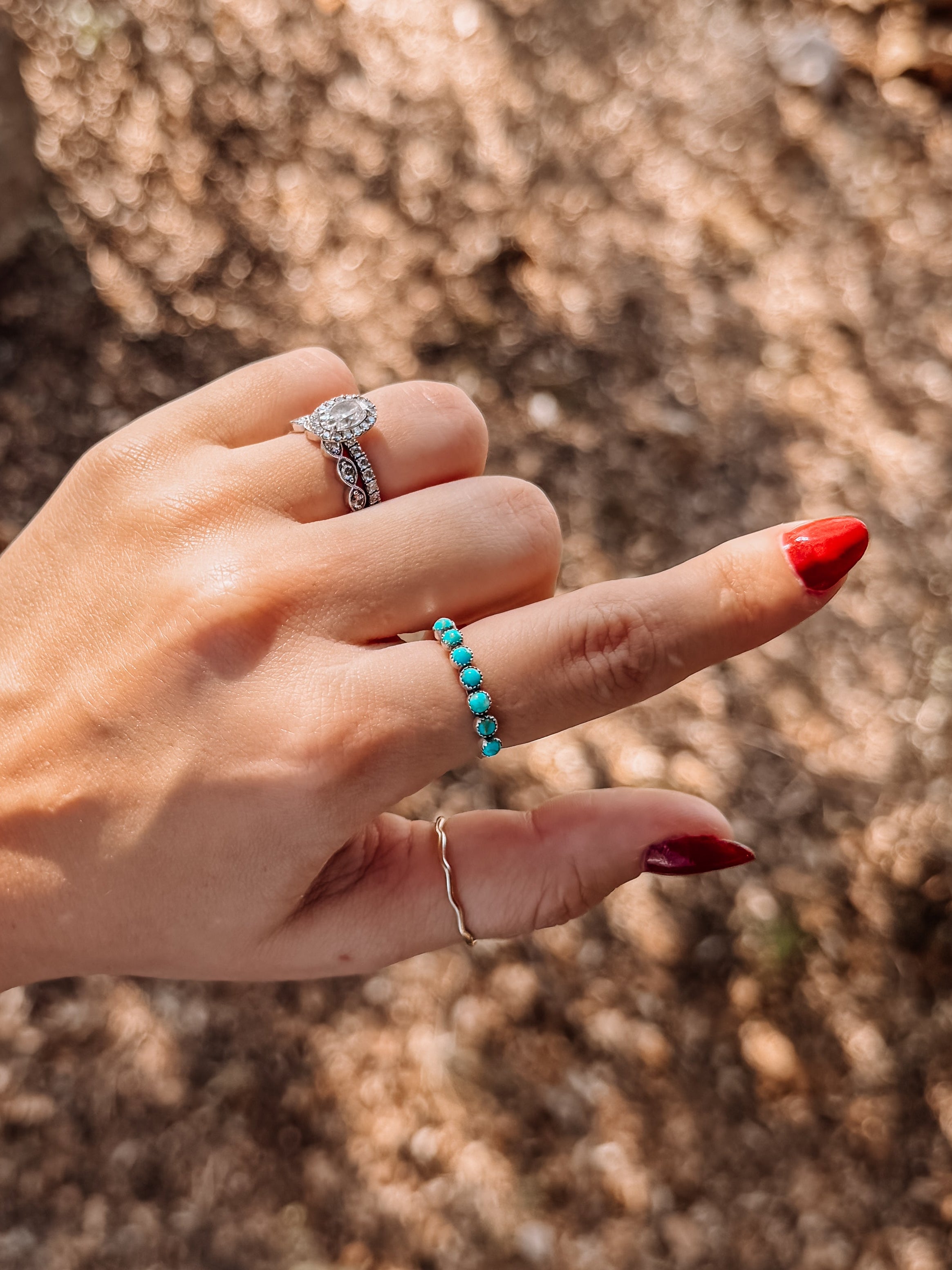This turquoise stacker ring features a row of vibrant natural turquoise stones set in sterling silver. Bold yet versatile, it’s perfect for layering or wearing alone as a colorful Western-inspired statement piece.