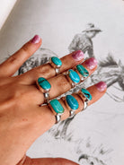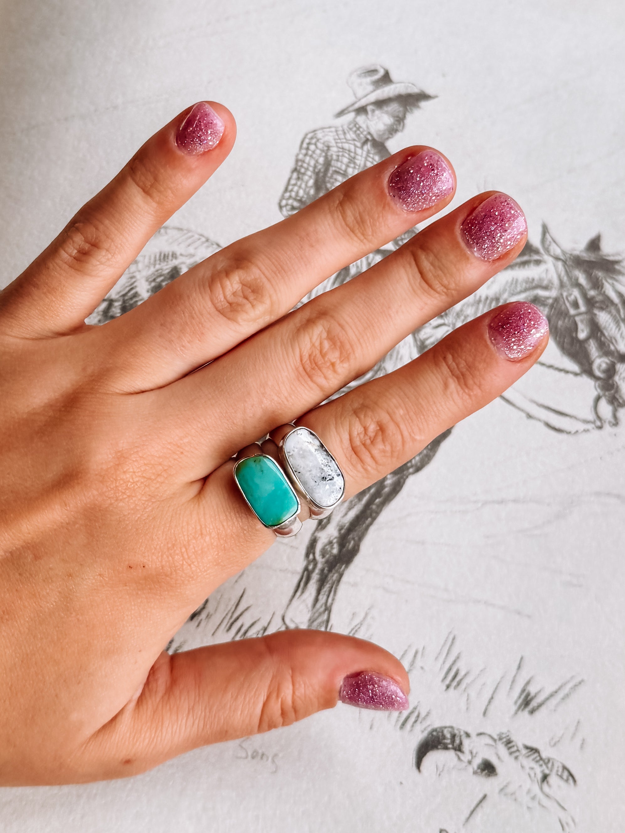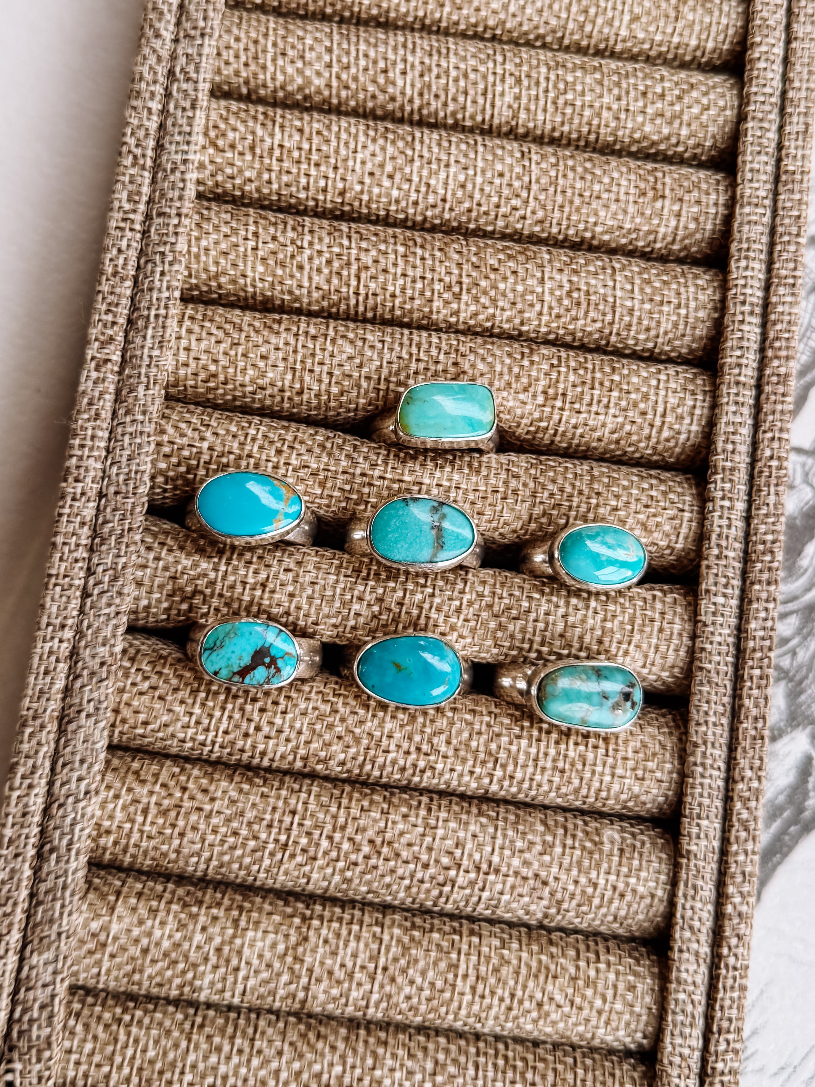 This sterling silver and turquoise ring features a vibrant horizontal-set stone for a sleek, modern Western look. Bold yet simple, it’s perfect for everyday wear or stacking with your favorite rings.